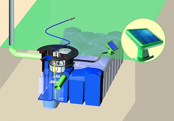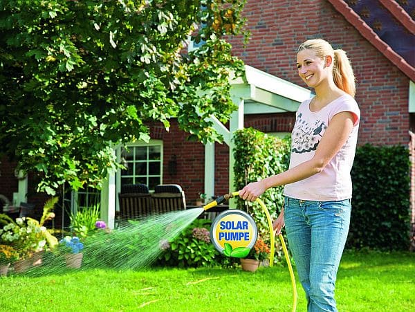 Besonders innovativ für die Gartenbewässerung mit Regenwasser sind die neuen Gartenanlagen von Rewatec mit einbaufreundlichen Erdtanks und solarbetriebener Gartenpumpe. Dabei wird im Erdtank bzw. in dessen Deckel eine Kontrollbox mit Akku, Druckschlauch und Tauchpumpe montiert. Den 20 x 30 cm großen Solarkollektor steckt man ganz einfach mithilfe eines Bodenpflocks in die Erde. Zur Wasserentnahme muss nur noch der Gartenschlauch aufgesteckt werden, die Solarpumpe arbeitet kabellos und schafft mit einer Akkuladung etwa 380 Liter Wasser bei einer maximalen Förderhöhe von neun Metern. Danach braucht der Akku ca. acht Stunden für die Neuaufladung.