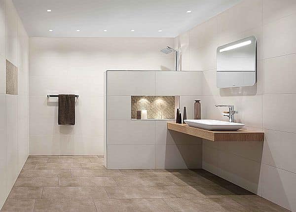 Die neue Renovierungsfliese flatile von Agrob Buchtal ist ideal für die lärm- und staubarmen Renovierung von Badezimmern. Diese nur 5 Millimeter starken Keramikfliesen aus verarbeitungsfreundlichem stranggezogenem Feinstein-zeug können auf geeigneten Untergründen verlegt werden, um unkompliziert und Wert steigernd alte Boden- oder Wandbeläge zu ersetzen. Foto: AGROB BUCHTAL