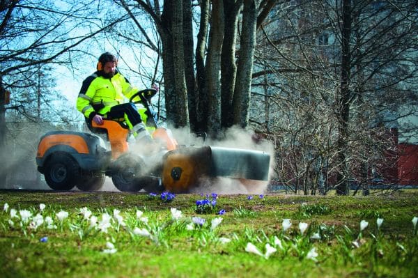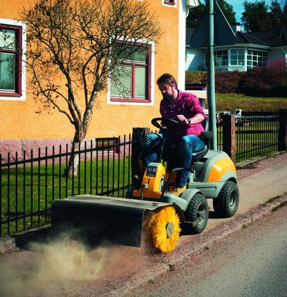 Kehrbürsten und -maschinen mit oder ohne Aufnahmebehälter ergänzen die Frontmäher von Stiga sinnvoll. (Foto: epr/Stiga)