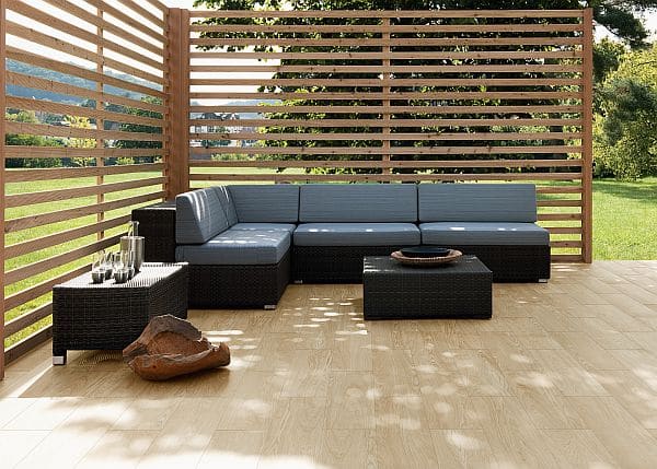 Dank der schmalen Formate der vilbostone-Feinsteinzeugfliesen lassen sich authentisch anmutende Parkett-Fußböden gestalten. Aufgrund ihrer Wetterfestigkeit stellt sie nicht zuletzt für den Außenbereich die perfekte Alternative zu Parkettdielen dar. (Foto: epr/© Villeroy & Boch, V&B Fliesen GmbH)